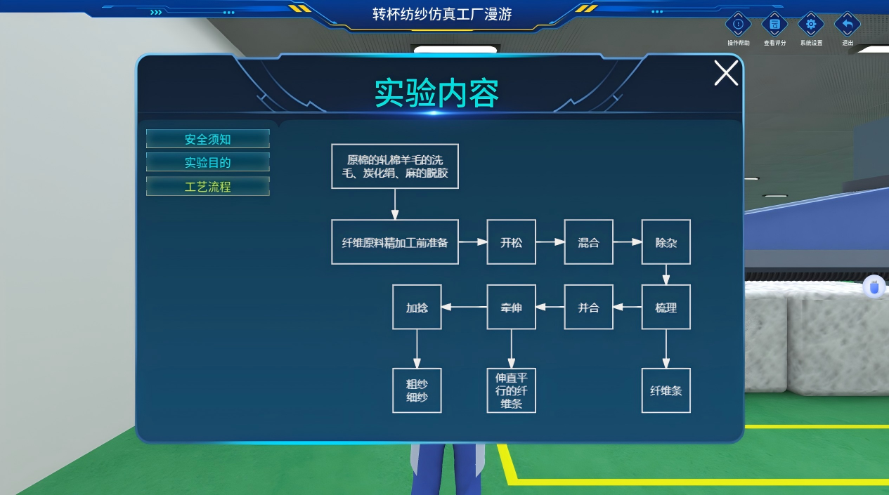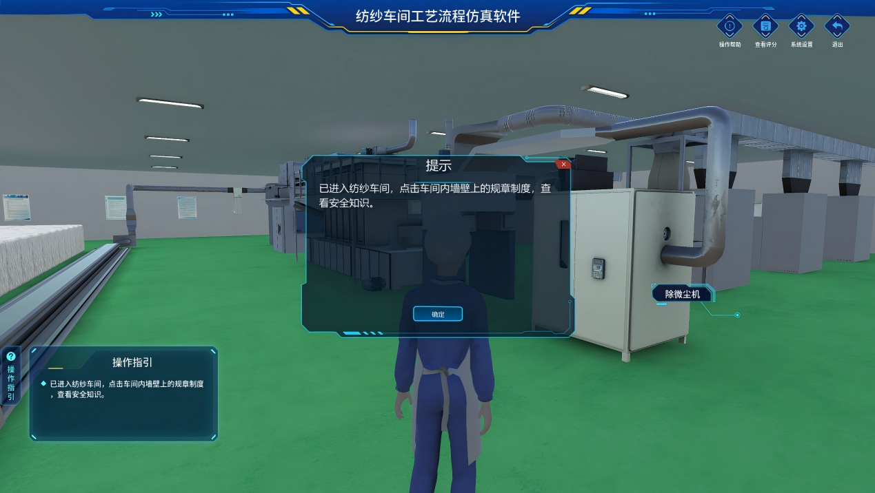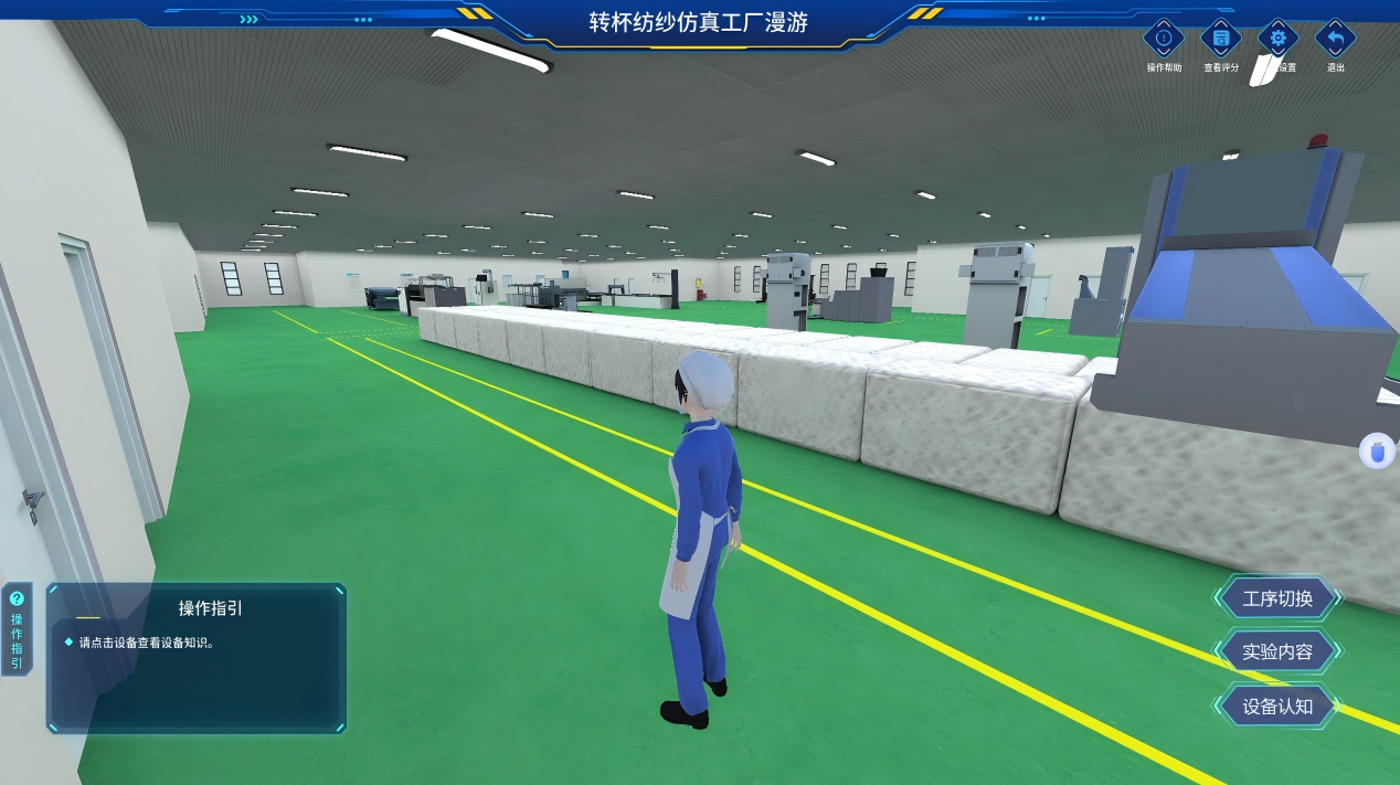 1、软件场景采用3D建模,以真实纺织工厂为基础进行建模,通过实际设备操作规程,使学生进行实际的操作练习。