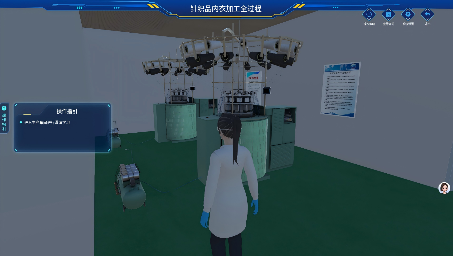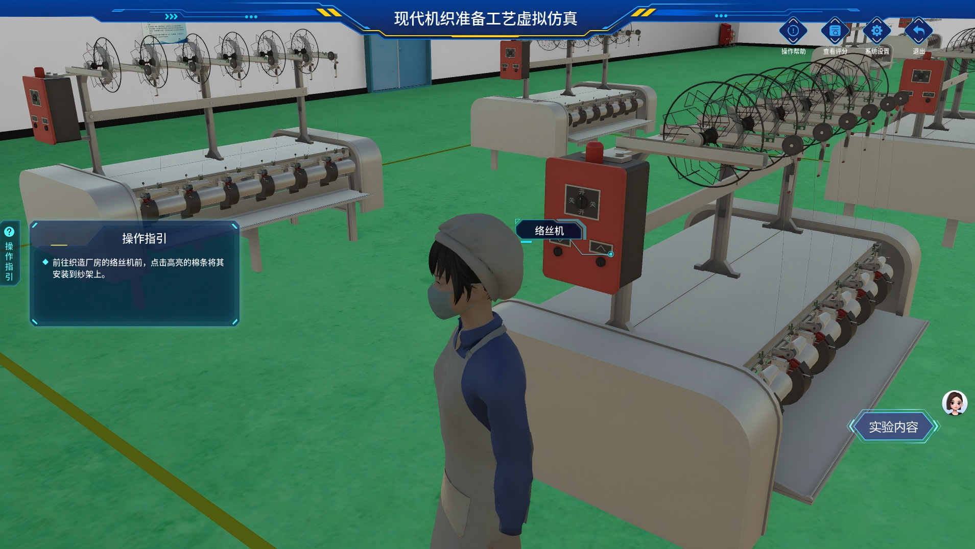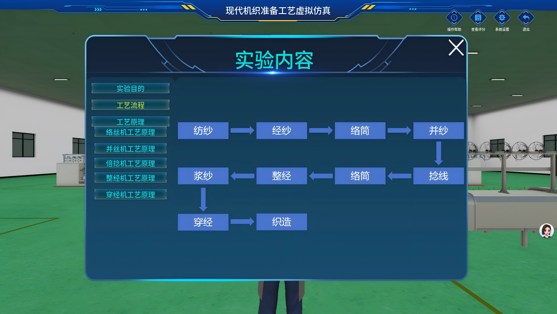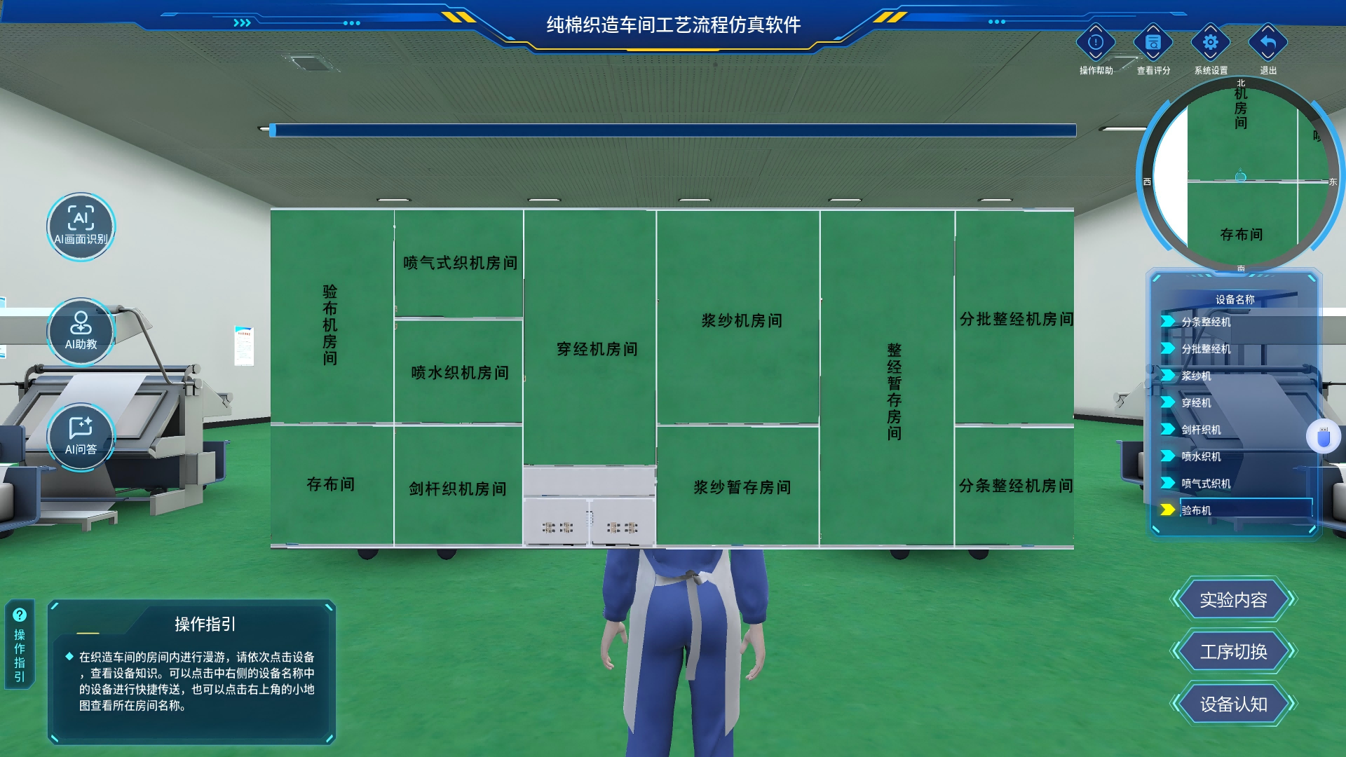 1、软件场景采用3D建模,以真实织造工厂为基础进行建模,通过实际设备操作规程,使学生进行实际的操作练习。