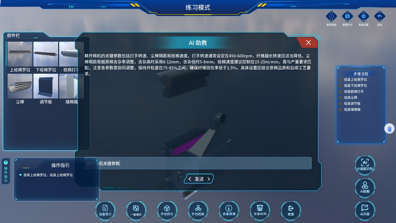 内置纺纱织造专业知识库,覆盖设备原理、工艺要点、故障排查等内容,学生操作中遇到问题可通过语音 / 文字提问(如 “梳棉机刺辊除杂的关键参数有哪些?”),AI 即时解答并推送相关动画 / 视频资料,支持多轮对话答疑。