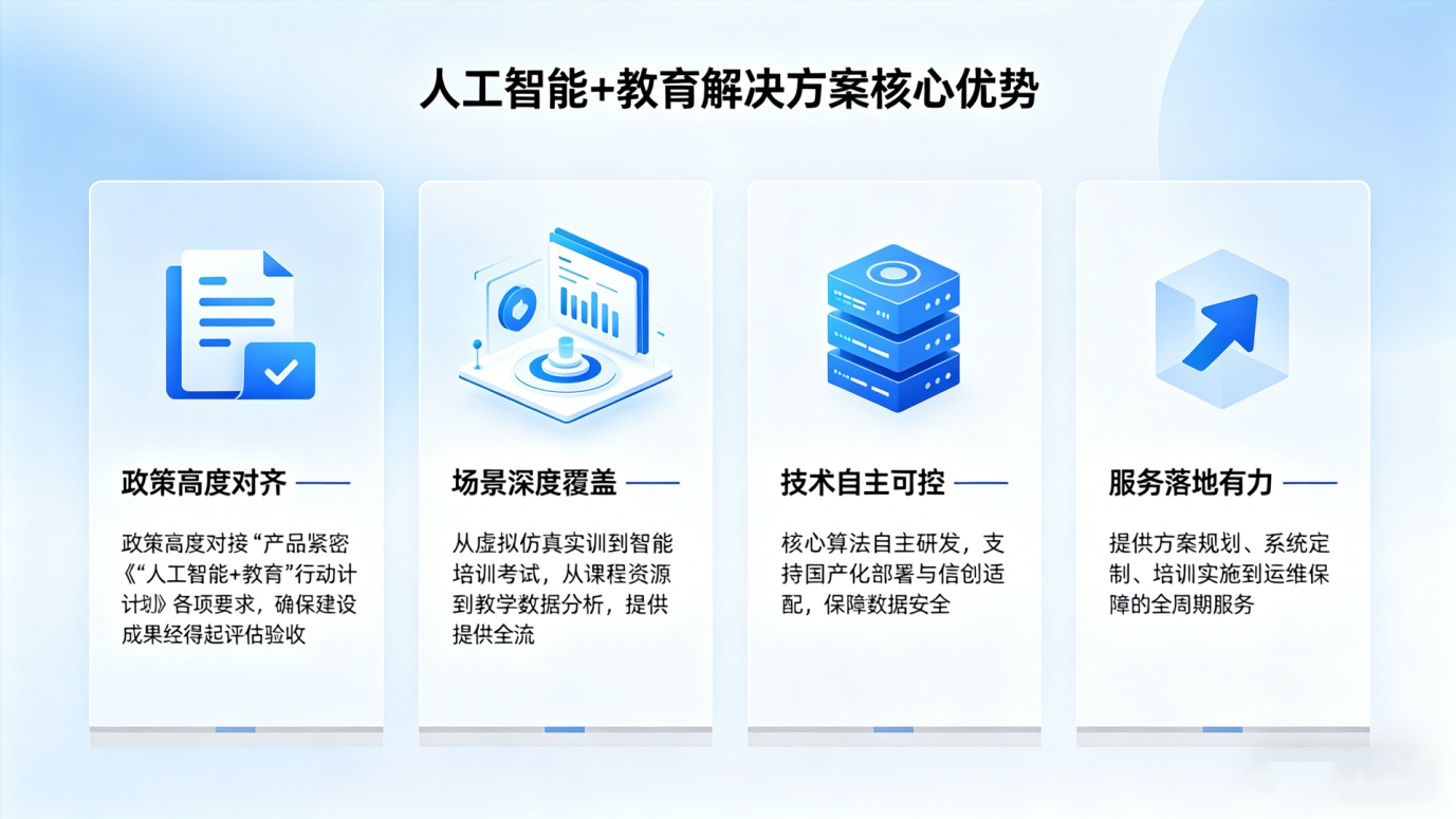 其一,政策高度对齐——产品紧密对接《“人工智能+教育”行动计划》各项要求,确保建设成果经得起评估验收。其二,场景深度覆盖——从虚拟仿真实训到智能培训考试,从课程资源到教学数据分析,提供全流程闭环方案。其三,技术自主可控——核心算法自主研发,支持国产化部署与信创适配,保障数据安全。其四,服务落地有力——提供方案规划、系统定制、培训实施到运维保障的全周期服务。