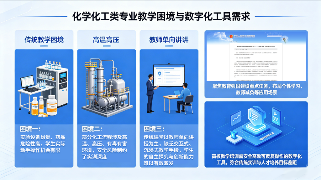 在高校教学培训领域,图灵锶AI化学化工虚拟仿真软件已广泛应用于课堂教学演示、学生自主实训、技能竞赛集训、教师教学能力提升等多种场景。教师可利用平台开展课前备课模拟与课中互动教学,学生可在课后自主完成虚拟实验并通过内置培训考试系统进行自我检测。平台还支持多人协同实验、远程教学指导,为“人机协同教学模式”的落地提供了切实可行的技术路径。无论是高职院校的技能型人才培养,还是本科院校的创新型人才培育,图灵锶虚拟仿真软件均能提供贴合需求的解决方案。
