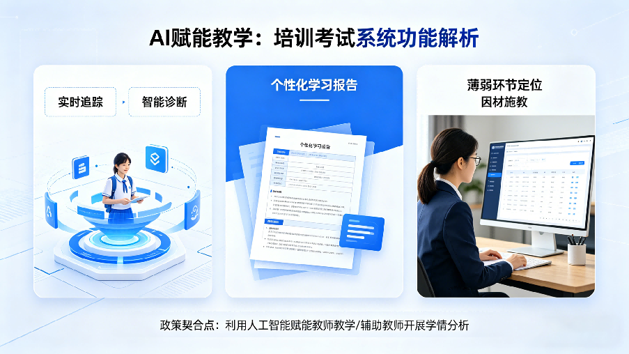 《行动计划》要求推动“智能命题、智能组卷、智能评卷”等应用,构建学生学习全过程纵向评价体系。公司培训考试系统内置AI自适应出题引擎,可依据学生历史答题数据动态调整题目难度,生成个性化能力报告;管理端提供多维度数据看板,辅助教务部门科学研判人才培养成效,为高校教学培训质量提升提供数据支撑。