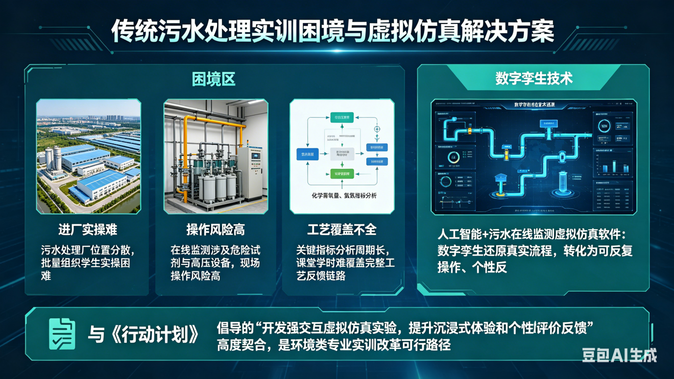 传统污水处理实训长期面临三重困境:污水处理厂多位于市政基础设施区,难以批量组织学生进厂实操;在线监测涉及强酸强碱试剂与高压电气设备,现场操作风险偏高;化学需氧量、氨氮等关键指标分析周期较长,课堂学时难以覆盖完整工艺反馈链路。“人工智能+污水在线监测虚拟仿真软件”以数字孪生技术还原真实工艺流程,将工业现场转化为可反复操作、可个性反馈的数字化学习空间。这一思路与《行动计划》倡导的“开发强交互虚拟仿真实验,提升沉浸式体验和个性评价反馈”高度契合,是环境类专业实训改革的可行路径。