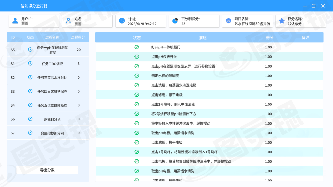 软件内置培训考试系统,支持按章节、知识点或岗位能力点灵活组卷,自动记录操作步骤、参数偏差与决策路径,生成多维度学习档案,兼容学时考核、技能等级认定、岗前培训等多种场景。结合智慧课程建设需求,软件可与学校学习管理平台对接,输出结构化学习数据,支撑教师开展循证教研,并为学生构建可追溯的能力图谱。这种人机协同的教学模式,正是《行动计划》强调的“探索人机协同教学模式”在环境类专业中的具体落地。