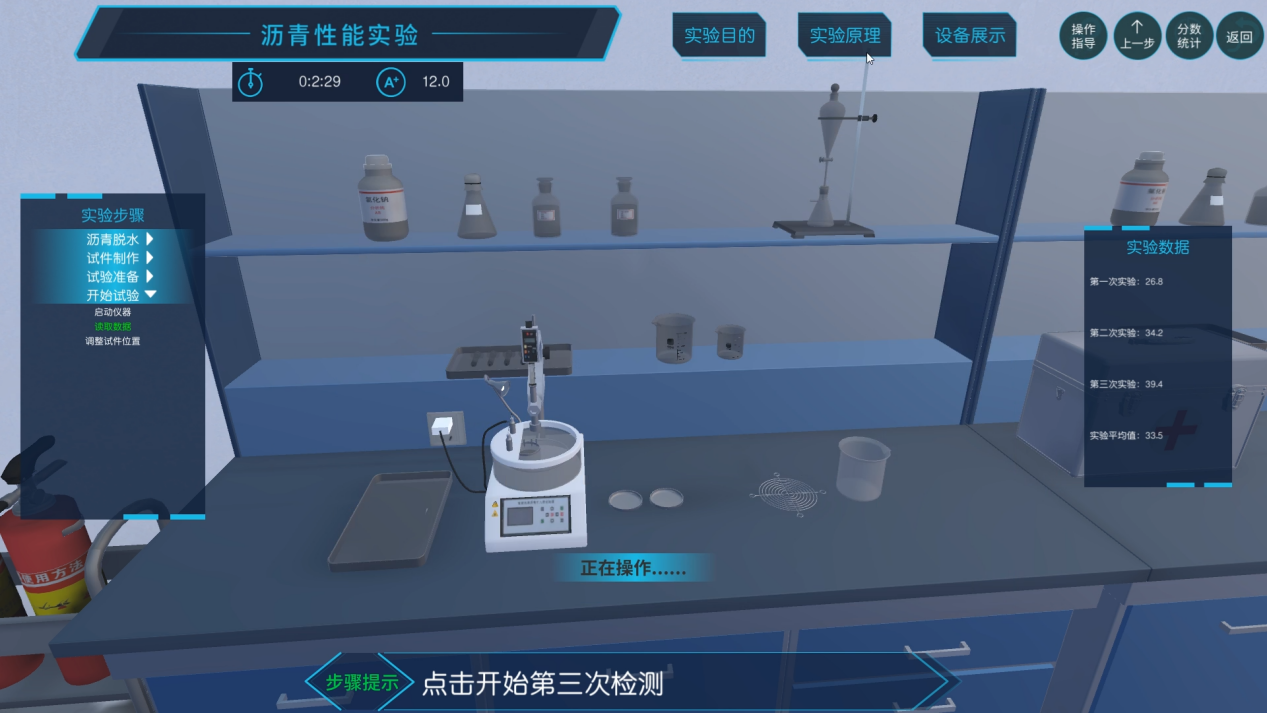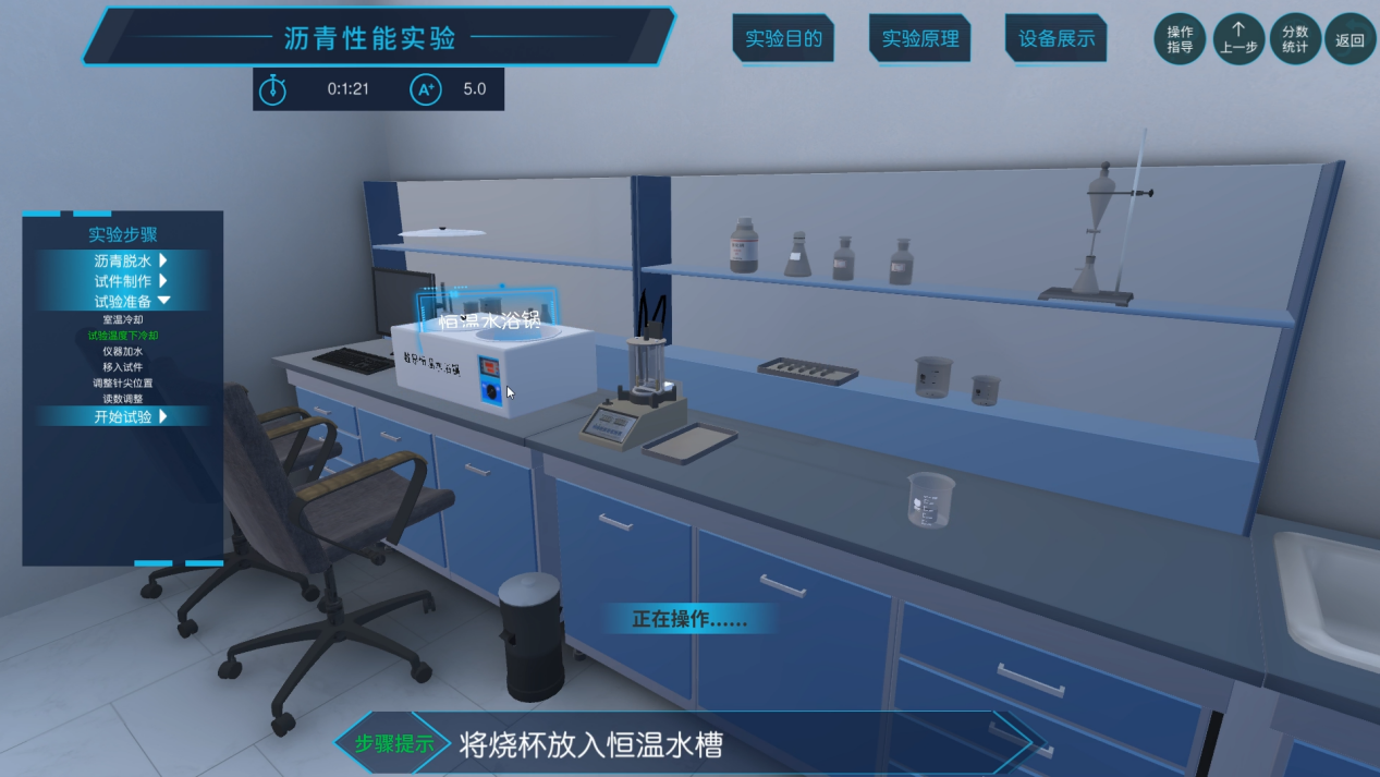 沥青性能实验虚拟仿真实验教学系统基于三维仿真技术,再现了实验室场景,学生可在虚拟环境中实现自主操控,在实验室内漫游,进行设备认知等操作,给予学生沉浸式的人机交互体验,增强了实验学习的趣味性,界面生动美观、易学易用,提高学生的学习兴趣和积极性。