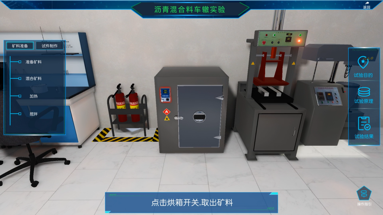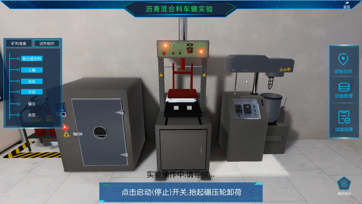 沥青车辙试验虚拟仿真软件基于三维仿真技术,再现了实验室场景,学生可在虚拟环境中实现自主操控,在实验室内漫游,进行设备认知等操作,给与学生沉浸式的人机交互体验,增强了实验学习的趣味性,界面生动美观、易学易用,提高学生的学习兴趣和积极性。本系统可选择试件制作进行试验或者道路沥青取样检测试验,帮助学生掌握和学习沥青车辙试验的目的及实验方法,帮助学生理解不同沥青混合料的抗车辙性能不同,试验结果以直观的曲线展示。