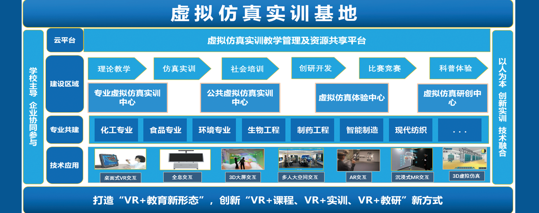 为响应教育部发布《关于职业教育示范性虚拟仿真实训基地建设工作的通知》{教职成司函【2020】26号}文件精神,利用智能硬件、虚拟现实技术等创新应用,融合企业和行业协会优秀资源,服务于学校、教师、学生等用户,有效推动教学实训创新,将创新理念、教学实训和专业课程紧密结合,将知识融于实践并在实践中深入理解;以技术驱动教学变革的思路进行,将信息技术和实训设施深度融合,构建具有感知性、沉浸性、交互性、构想性、智能性的虚拟仿真实训教学场所,搭建以实带虚、以虚助实、虚实结合的虚拟仿真实训系统,配置相应的虚拟仿真实训设备。