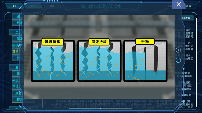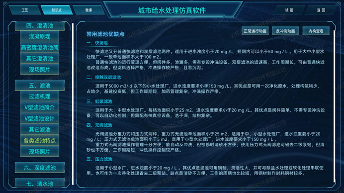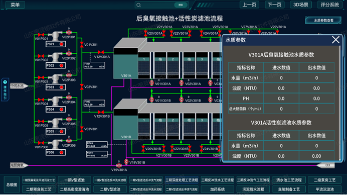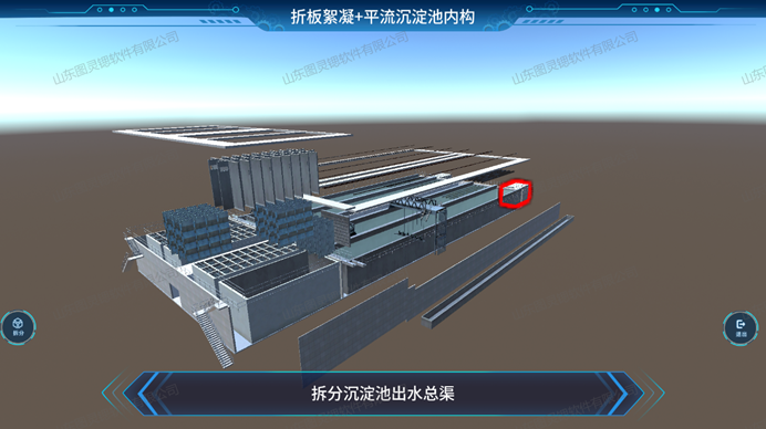 本软件可以满足学生在3D现场和DCS控制界面,按照引导完成整个供水处理的操作流程学习。并且在操作流程中加入了对相关理论知识的阐述,和相关设备的模型拆解,能够让学生摆脱平面的课本与抽象的理论描述,直观地建立对工艺设备的认知。