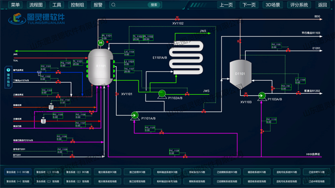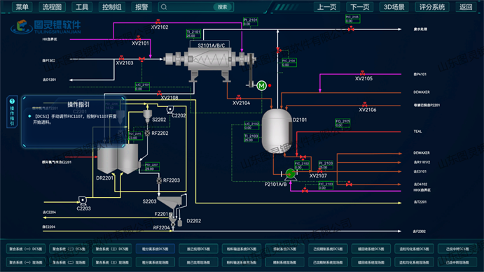 本软件依据计算机虚拟仿真技术进行开发,运用数字化技术真实再现聚乙烯制备工段的 DCS 控制系统界面,用户可通过 DCS 控制系统界面进行操作,实际运行界面可对操作进行实时评分,得出综合的操作成果评估;该软件具备后台数据运算能力,以真实化工企业工艺参数作为参照,仿真操作过程与真实工厂操作过程极其相似,能够满足日常培训、常规考核等各种需求。
