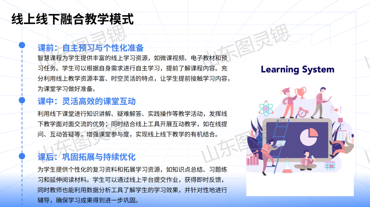 智慧课程实现课前、课中、课后全流程融合:课前学生通过线上平台自主预习,获取微课视频、电子教材等资源;课中线下课堂进行知识讲解与实践操作,结合线上工具开展互动教学;课后线上平台提供个性化复习资料,学生提交作业获即时反馈,教师通过数据分析针对性辅导。
