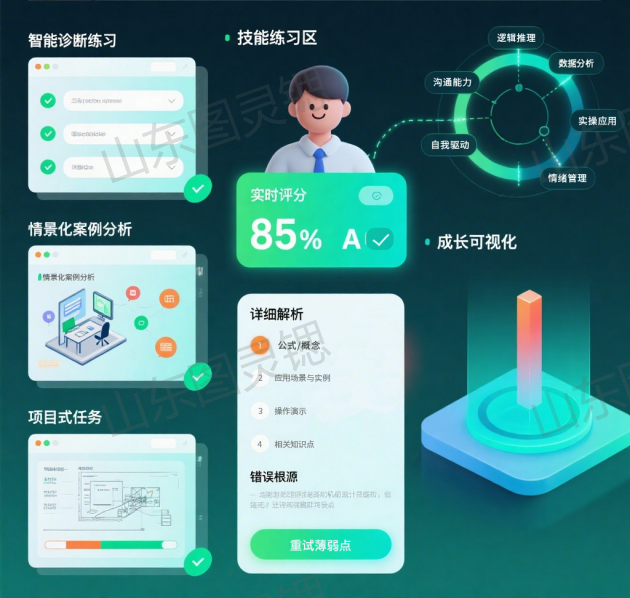 智慧方案:学习过程嵌入智能诊断练习、情景化案例分析、项目式任务。完成即得实时评分与详细解析,精准定位错误根源;能力雷达图/进度看板,清晰量化知识掌握度与技能成长轨迹;自适应强化训练,针对薄弱点推送专项练习,巩固记忆。让进步看得见,让努力有回响!
