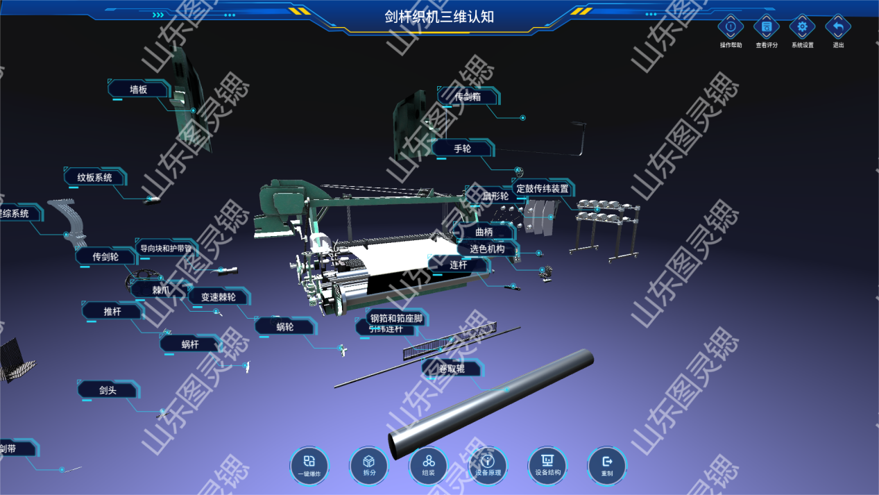 剑杆织机、喷气织机等10+主流机型1:1建模,支持360°爆炸视图拆解。