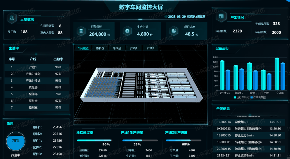 多类型传感器全方位采集生产数据,通过工业互联网接入云端,实现秒级可视化。操作人员可在中控室、大屏或移动端实时查看产线健康状况。