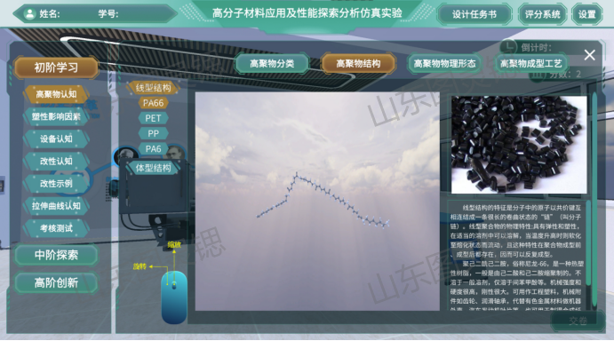无需担心昂贵设备损耗,学生可通过 3D 建模的虚拟实验台,直观认识拉伸试验机的构造,在 AI 引导下完成标准操作流程。软件内置的 “材料百科” 功能,能实时关联聚乙烯、聚丙烯等常见高分子材料的微观结构,让抽象概念可视化。