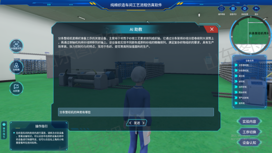 AI 智能功能创新:软件内置的AI 核心模块成为此次调研的焦点。技术团队演示了三大 AI 应用场景:一是 “AI 工艺推荐”,输入纤维原料(如新疆长绒棉)、产品需求(如高支高密坯布),系统可自动生成最优生产参数;二是 “AI 故障诊断”,模拟织机断经、染缸色差等常见问题,AI 能在 3 秒内定位故障原因并给出解决方案;三是 “AI 教学答疑”,针对学生实操中的疑问(如 “如何调整浆纱湿度”),系统可通过语音交互实时解答。王国和教授对此评价:“AI 技术与纺织教学的结合,不仅能提升实训效率,更能培养学生的数字化思维,这正是行业未来需要的人才方向。”